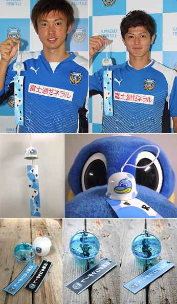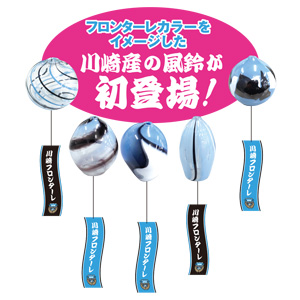 ◇川崎フロンターレ特製風鈴も特別販売 「川崎大師風鈴市in等々力」開催に際して、川崎フロンターレバージョンの風鈴を特別販売。今年はフロンターレファミリーアートディレクター大塚いちお氏監修によるオリジナルデザインです。 また歴代のオリジナル風鈴も販売します。