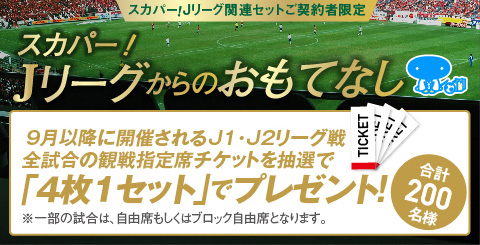 Jリーグオフィシャルブロードキャスティングパートナーのスカパー!は、日頃ご愛顧いただいているスカパー!Jリーグ関連セットご契約者様を対象に、9月以降に開催されるJ1・J2リーグ戦全試合の観戦指定席チケット(4枚1セット)を合計で200名様にプレゼントいたします!詳細は、以下の通りです。