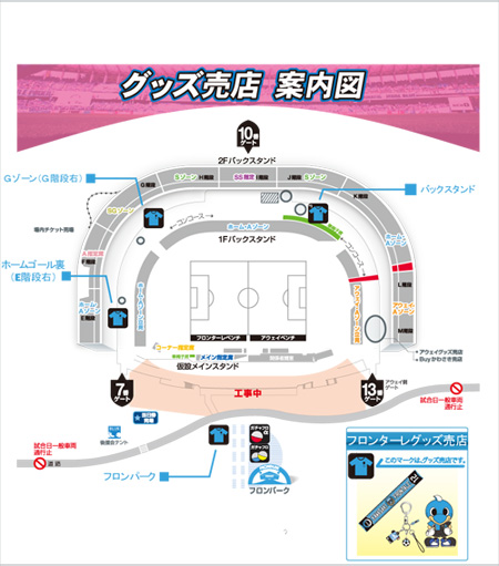 | 場所 | <取扱売店> ・フロンパーク特設ブース:○ ・Gゾーングッズ売店:○ ・ゴール裏グッズ売店:× ・アウェイグッズ売店:× |