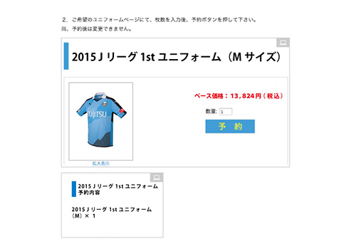 2. ログイン後、2015ユニフォームページにてサイズ・枚数を選択し、予約ボタンを押してください。