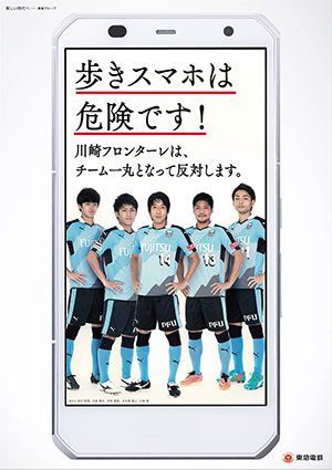 「歩きスマホに関するマナー向上ポスター」は、大久保嘉人選手、中村憲剛選手、小林悠選手、大島僚太選手、谷口彰悟選手が登場し、歩きながらのスマートフォン操作について注意を呼びかける内容になっています。