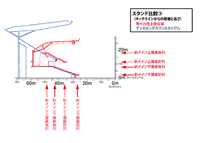 陸上トラックがあり、規模的に近いスタジアムのメインスタンドとの比較です。
