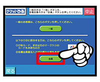 7.「一般」か「会員」かを選ぶ画面では必ず「会員」をタッチし、続けて後援会会員番号の先頭に「00」をつけた15桁を入力してください。※数字と数字の間にスペースは不要です。
