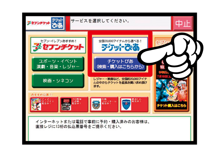 2.「マルチコピー機」トップ画面で「エンタメチケット」→「チケットぴあ」→「Pコードで探す」の順に画面タッチしていきます。