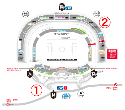 | 1 | メインSS指定、バックSS指定、メインS、バックS自由、メイン自由・南、SG自由、ホームA自由、各種バラエティシート、メイン車椅子席 | メインスタンド前広場 「特設ブース」 |
