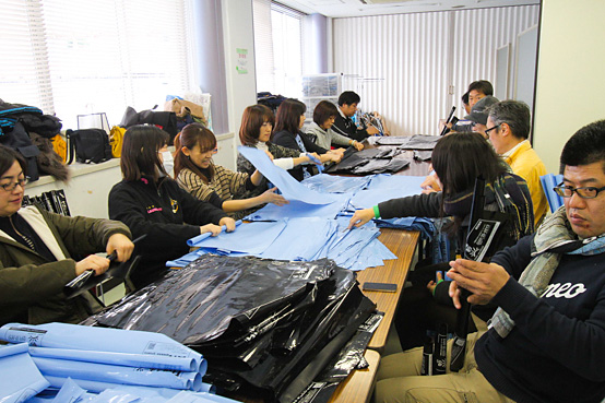 試合当日、選手入場時に掲出するパネル・フラッグの事前準備作業