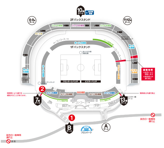 ①Bゲート ※サイド・バックスタンドのチケットをお持ちの方は7番・10番ゲートよりご入場ください。