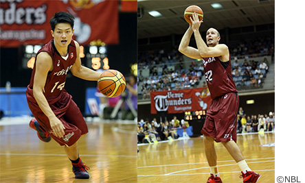 特に昨年度は、NBL初代王者にして天皇杯優勝と2冠を達成した。今シーズンは、カンファレンス3位に位置しているが、今年に入ってからの後半戦は15勝3敗(3月27日現在、前半戦15勝8敗)と調子を上げてきている。ここからのリーグ終盤戦に向け、日本代表のスリーポイントシューター辻直人選手(写真左)や元NBAプレーヤーで2m10cmのニック・ファジーカス選手(写真右)を中心に2連覇を目指す。