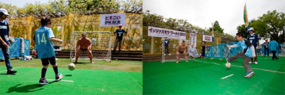 春日山部屋力士がGKになったミニゴールでPK対決 |