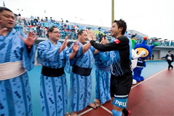 勝利時に春日山部屋力士とフロンターレ選手が「張り」タッチ! |