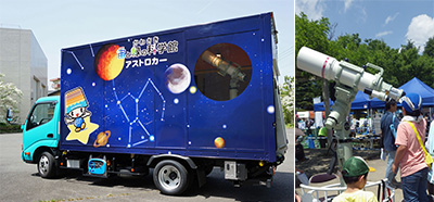 市内各地で実施する天体観察会、自然・科学イベント等において、多くの市民が星空の美しさを体験し、宇宙や自然・科学に興味や関心をもっていただけるように大型望遠鏡をはじめ、小型望遠鏡・映像装置を備えた移動天文車。実際の車両は会場でごらんください。 |