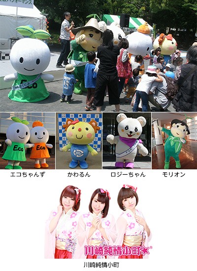 | 内容 | ◇今まで市内で行われたエコイベントなどでエコをPRしてきたかわさきのエコキャラクター、エコちゃんず(CCかわさきイメージキャラクター)、かわるん(かわさき3R推進キャラクター)、モリオン(川崎市民100万本植樹事業イメージキャラクター)、ロジーちゃん(なかはらエコ推進大使)が出題する○☓エコクイズにチャレンジしてグッズをゲットしよう。 ◇川崎純情小町☆が司会で参上!ミニライブも披露します。 |