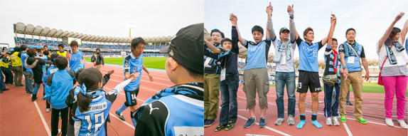 川崎フロンターレが勝利時、試合直後にピッチ横トラック上にて、選手とハイタッチをし、共に万歳三唱をします。