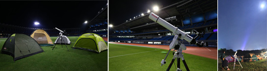 | 【その1】 VIXEN presents 『等々力天体観測所』開設! 特別協賛: ![]() 等々力陸上競技場フィールド内に『VIXEN天体観測所』を開設して天体観測会 を実施します。まず、6Fスカイテラスにて専門スタッフからこの時期に見える星のレクチャーをしていただいたあと、フィールドに降りて専門スタッフの解説を聞きながら真っ暗なスタジアムの上空に輝く星空を観測します!この時期は皆さんがよく知っている「土星」や、七夕でおなじみの「彦星」「織姫」が肉眼でも良く見えます。また、運が良ければ流れ星や人工衛星が見えるかも!? ![]() ※写真はイメージ |