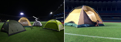 天体望遠鏡メーカーとして有名なVIXEN(ビクセン)協賛のもと、場内フィールド上に『等々力天体観測所』を開設。真っ暗なスタジアムの上空に輝く星空を観測します。宿泊は、アウトドアメーカーとして有名なCOLEMAN(コールマン)協賛の『等々力テントフィールド』で就寝。競技場内フィールド付近に設営されたテントに泊まり、翌日の多摩川クラシコに一番乗りしてもらいます。また、当日は中原区危機管理担当による防災教室も開催。