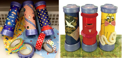 | 【その1】 望遠鏡作り キットに入っている材料を使って倍率3倍の望遠鏡が作れます。望遠鏡の本体には折り紙やシールを貼って自分だけのオリジナル望遠鏡を作ろう!