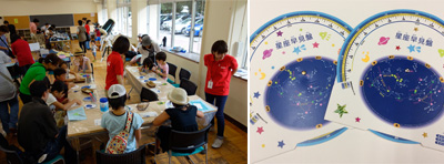| 【その2】 星座早見盤作り 東西南北の夜空に見える星座が簡単に分かる「星座早見盤」。星の明るさもマーク別になっているので、どの星が何等星かも一目瞭然。最後にシールやスタンプでデコレーションしたらオリジナル早見盤の出来上がり!