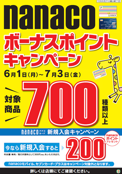 | その他 | 今ならnanacoボーナスポイント対象商品が700種類以上!さらにnanacoカード新規入会で200ポイントプレゼント中!ぜひこの機会にご入会ください。 ※全国のセブン‐イレブンで実施しています。 ◇実施期間:6月1日(月)〜7月3日(金)まで ![]() |