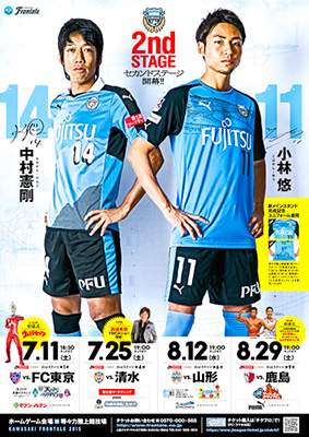 川崎市内の商店街やサポートショップの皆さんに掲示していただいている、ホームゲームの予定を伝える「スケジュールポスター」。今回は2015シーズンの1stユニフォームを着用した中村憲剛選手と、「新メインスタンド完成記念ユニフォーム」を着用した小林悠選手が登場。このポスターを手に入れることができるキャンペーンを開催します!!オフィシャルショップ「アズーロ・ネロ」、川崎フロンターレが運営するフットサル場「フロンタウンさぎぬま」、東急ハンズ川崎店、の全3店舗にて実施です。