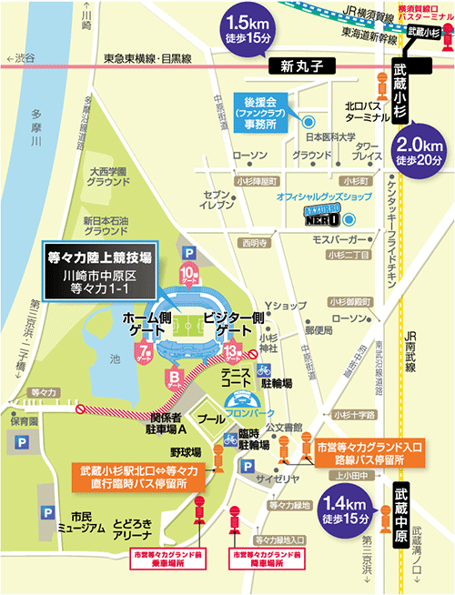 川崎フロンターレ主管のホームゲーム開催日において、JR武蔵小杉駅横須賀線口から等々力陸上競技場へ運行されている直行臨時バス(有料 ※運行:東急バス)ですが、7月7日ボルシア・ドルトムントより運行時刻が変更されることになりましたので、お知らせいたします。