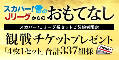 Jリーグオフィシャルブロードキャスティングパートナーのスカパー!は、日頃ご愛顧いただいているスカパー!Jリーグ系セットご契約者様を対象に、8月15日以降に開催されるJ1・J2・J3リーグ戦の全試合の観戦指定席チケット(4枚1セット)を合計で337名様にプレゼントいたします。