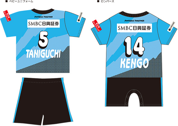 ベビーサイズのユニフォームとロンパースにお好みのネーム・ナンバー(背面のみ圧着)を付けられちゃいます。