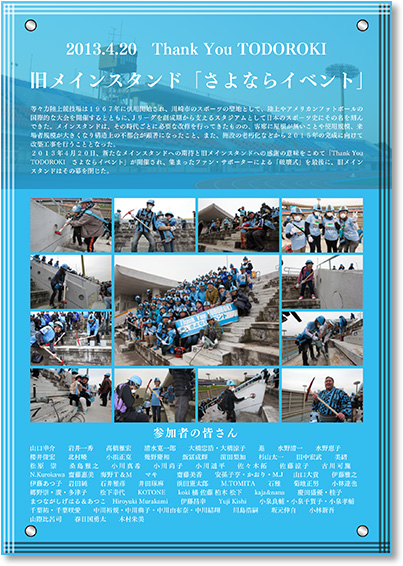 「等々力陸上競技場の全面改修を推進する会」(構成団体:川崎フロンターレサポーター、川崎市サッカー協会、川崎市陸上競技協会、川崎フロンターレ)主催で、等々力陸上競技場の旧メインスタンドが解体される際に実施した、「Thank You TODOROKI さよならイベント」を記念するパネルが新メインスタンドに設置されることになりましたので、お知らせいたします。