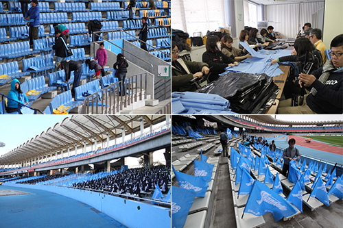 試合当日、選手入場時に掲出するパネル・フラッグの事前準備作業