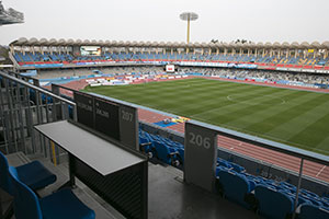 メインスタンド下層と上層の南側にあるテーブルシート。ノートPCを広げると気分はサッカー記者?それもそのはず、記者席と同じ作りなんです。もちろん、食べ物や飲み物を置くのにも便利。2人掛けなので全席通路側となります。