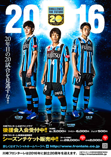 掲載選手は、2016シーズンユニフォームを着用した中村憲剛選手、小林悠選手、谷口彰悟選手。