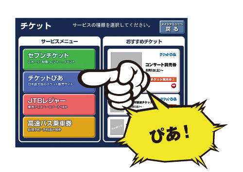 2.トップ画面から 「チケット」 → 「チケットぴあ」 → 「Pコードで探す」 の順に進む。