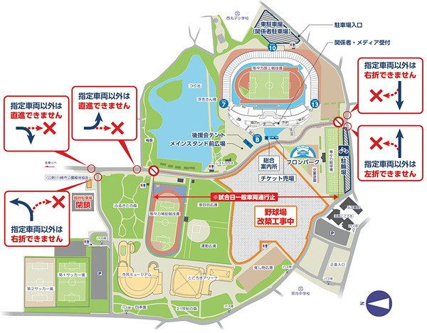・2016シーズンは、野球場工事等に伴い、等々力緑地内の駐車場が大幅に減少いたしますので、ご来場の際は公共交通機関(電車・バス)のご利用をお願いします。