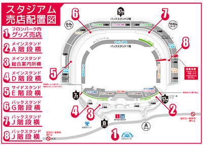 | ◇スタジアム案内図 場外・場内総合案内所、各ゲート、各チケット売場にてポケット観戦ガイドを配布いたします。 PDF版は現在作成中です!!ダウンロードページは追ってご案内いたします。 |