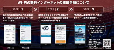 FRONTALE FREE Wi-Fiは、等々力陸上競技場での新しいサッカー観戦のスタイルを可能にする無料Wi-Fiサービスです。 |