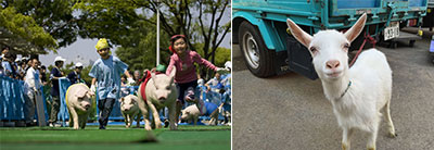 子ども4名が子ブタや子ヤギと一緒にゴールを目指すコーナー。毎年恒例の子ブタと、今回が初参加の子ヤギがそれぞれ5回ずつかけっこします。