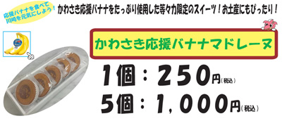 | 飲食⑧ | ◆かわさき応援バナナのチョコバナナ![]() ◇かわさき応援バナナのチョコバナナ:200円 ※クジで当たりが出るともう1本「ホワイト」チョコバナナをプレゼント ※かわさき応援バナナの売上の一部は、「等々力陸上競技場改築の費用」として川崎市へ寄付いたします |