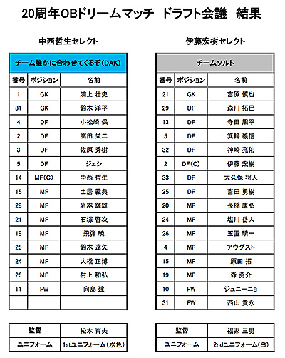 | 内容 | 5月14日(土)のOBドリームマッチに向けて、チーム分けドラフト会議を実施いたします。このドラフト会議はチームを代表して中西哲生と伊藤宏樹が参加し、OBドリームマッチ当日のチーム分けを決定いたします。なお、このドラフト会議の様子を、ニコニコ生放送にて中継いたしますので、ぜひご覧ください!! 協力:サッカーキング ハーフタイム 視聴方法:詳しくはこちら http://live.nicovideo.jp/ |