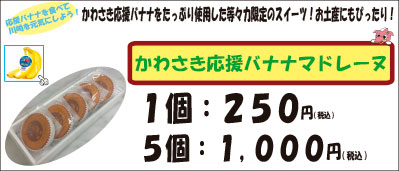 | 飲食⑧ | ◆かわさき応援バナナのチョコバナナ![]() ◇かわさき応援バナナのチョコバナナ:200円 ※クジで当たりが出るともう1本「ホワイト」チョコバナナをプレゼント ※かわさき応援バナナの売上の一部は、「等々力陸上競技場改築の費用」として川崎市へ寄付いたします |