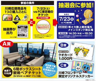 川崎応援商品を買うと付いてくる抽選券(レシート)と、セブン-イレブンで発券された「7/23(土)vsFC東京のチケット」もしくは「7/23(土)vsFC東京の川崎フロンターレシーズンチケット」のセットで抽選会に参加できます。 抽選日・抽選会場は7/23(土)vsFC東京戦時の等々力陸上競技場外メインスタンド前広場となります。実施時間は14:30(予定)〜18:30です。 ※スタジアム開場時間が変更になった場合、開始時間が前倒しになる可能性がございます |