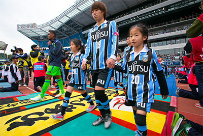 川崎フロンターレの公式戦(ホームゲーム)の際、両チーム選手と手をつないで入場(最大22名)、フラッグを持ちピッチに入場(最大14名)します。
