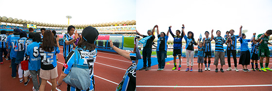 川崎フロンターレが勝利時、試合直後にピッチ横トラック上にて、選手とハイタッチをし、共に万歳三唱をします。