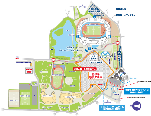 等々力緑地再編整備に伴う、正面広場周辺の整備工事が一部終了し、川崎フロンターレ主管のホームゲーム開催日においても変更点がありますので、下記の通りお知らせいたします。