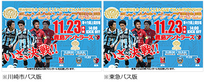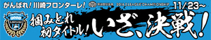 | キャンペーン⑤ | 川崎市内街頭大型ビジョンでチャンピオンシップ告知VTR、テロップ放映 【協力】ラゾーナ川崎プラザ、川崎アゼリア商店会、川崎ルフロン、川崎市、株式会社小杉ビジョン、みぞのくち新都市株式会社 【開始日】11/17(木)〜 【川崎駅付近】ラゾーナ川崎プラザビジョン、アゼリアビジョン、川崎ルフロンビジョン、河川情報表示板 【武蔵小杉駅】小杉ビジョン(こすぎコアパーク内) 【武蔵溝ノ口駅】ノクティビジョン