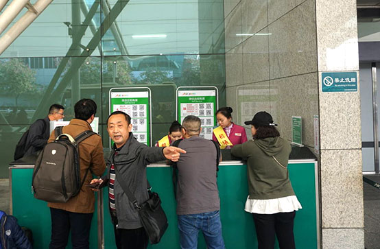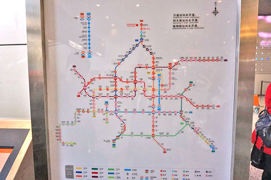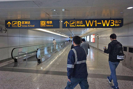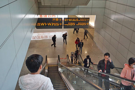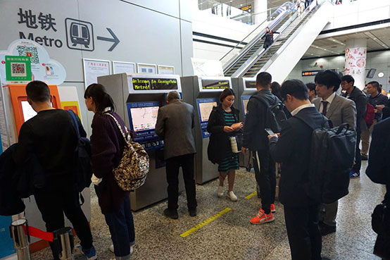●「広州白雲国際空港」から地下鉄、「地鉄(Metro)」のサイン下のエスカレーターを-1階(地下1階)に降りて右へ。チケット売場(自動券売機)で「二号線LINE2越秀公園」までの切符を購入し(7元)、三号線で「嘉禾望崗」へ、二号線に乗り換え「越秀公園」下車、D1出口を出て直進、徒歩1分。約40分