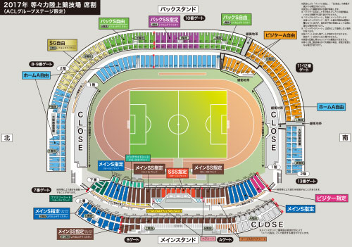 | ◇スタジアム案内図 ※Jリーグ開催時と一部運用が異なる部分がございますので、ご注意ください。 場外・場内総合案内所、各ゲート、各チケット売場にてポケット観戦ガイドを配布!! |