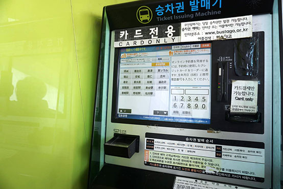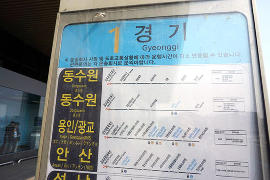 2階を出てチケット売場(日本語ガイドありの券売機)にて「東水原(Dongsuwon)行き」を購入(6,000ウォン)。1番乗り場よりバスに乗車し「ホテルキャッスル」へ。(15〜20分間隔、所要約60分)