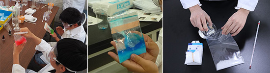 | 内容 | 数年前から「瞬間冷却材」が、省エネ、地球温暖化、また熱中症の対策として、注目されて、夏場になるとお店にたくさんの商品がならぶようになりました。実はこの「瞬間冷却材」は化学反応を利用した商品です。 ※作った瞬間冷え冷えパックはお土産にお持ち帰りすることもできます。 |