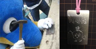 マシニング加工機で刃物を使用し、金属加工技術を加えた「川崎魂」の文字とカブレラのイラストが入ったアルミのオリジナルキーホルダーに、自分のイニシャルなどを打ち込む体験ができます。 |