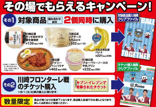 その場でもらえるキャンペーン!セブン-イレブンで川崎フロンターレ応援対象商品を2個同時にお買い上げのお客様にその場で対象商品購入特典オリジナルクリアファイルをプレゼント!