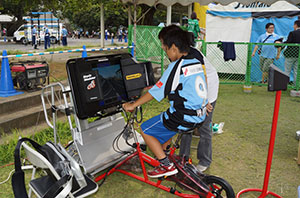 自転車走行を疑似体験できる「自転車シミュレーター」を使って、道路状況に応じた自転車の安全な利用方法を身につけましょう。